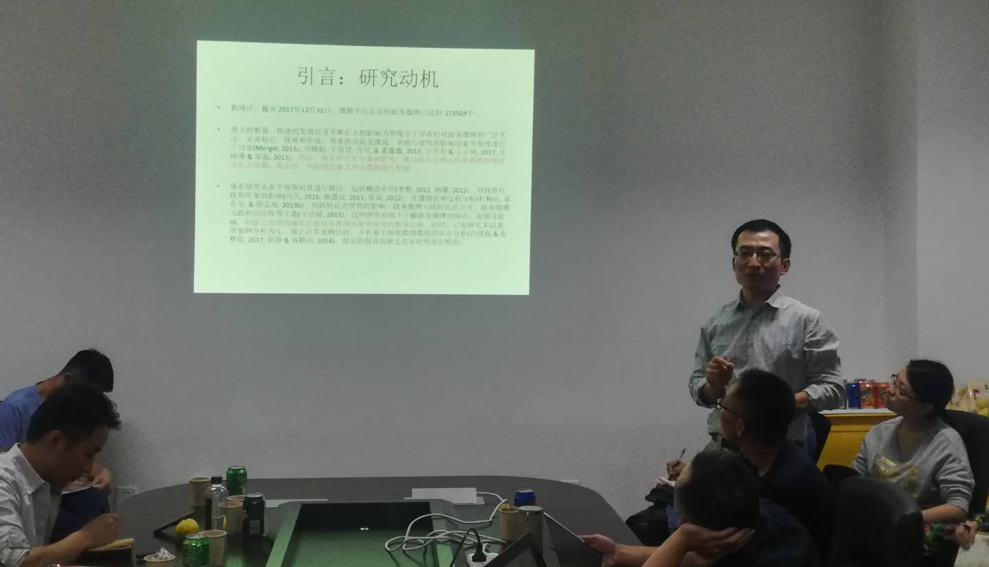 孙宗锋老师运用大数据技术,探讨中国城市政务微博发展及其影响因素。与传统“理论驱动”方法有所不同,大数据倡导“数据驱动”,运用自动文本分析中的词频、词云分析,主题建模与社会网络分析等方法,对海量政务微博文本进行处理,勾勒出当前城市政务微博发展的整体面貌,同时孙老师结合“大数据”与“小数据”两种方法,对城市间政务微博发展的影响因素做出实证检验。针对移动政务问题,曹现强教授提出,政务微博发帖量的差异,是否因互动平台数量的差异造成,还待进一步研究;马奔教授从公共政策空间角度出发,认为可着重探讨微博上的政民互动有哪些促成了公共政策的产生;王军洋老师指出,微博发帖量的激增是否存在政策文件的效应;部分学生提出是否要对不同部门的微博进行分析研究、自变量选取是否存在多重共线性等问题。