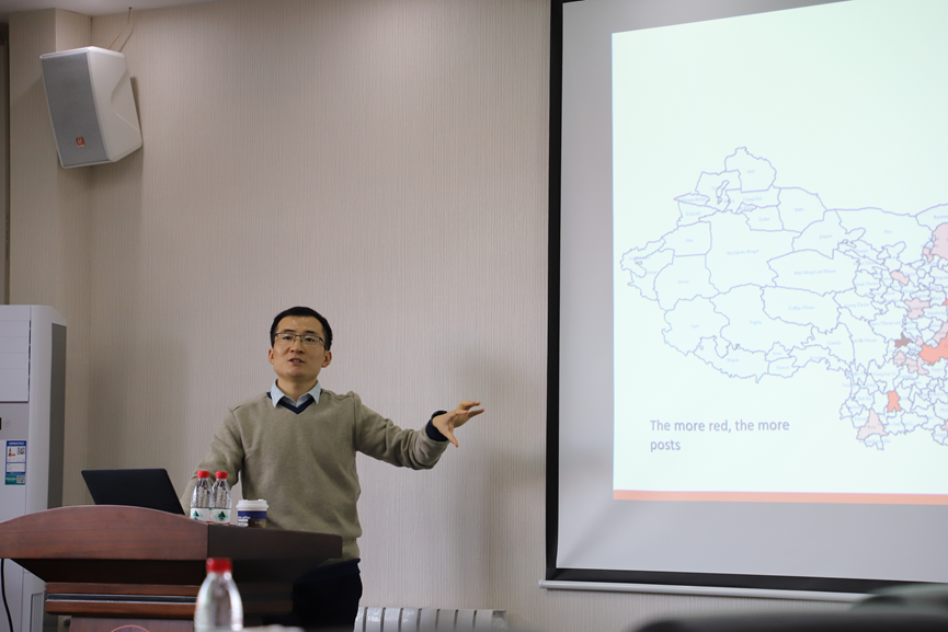 10月21日下午,本学期澳门网投官方网站望远学术沙龙第二期暨人文社科大数据应用研讨会在华岗苑南楼四楼大厅会议室顺利举办,澳门网投相关专业50余名师生参与了本次活动。本次沙龙由孙宗锋老师主持,邀请澳门网投官方网站澳门网投孙宗锋老师、韩自强老师、毛庆铎博士与澳门网投官方网站经济学院韩振老师、西安交通大学公共政策与管理学院石佳老师主讲。