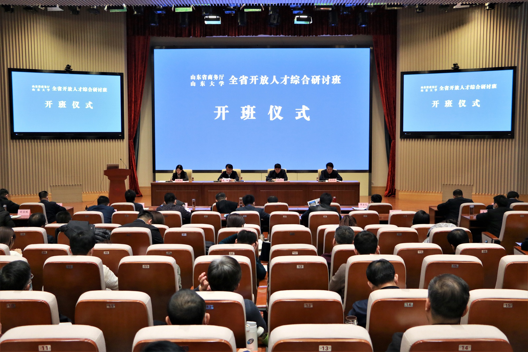 2020年11月30日,山东省开放人才综合研讨班开班式在澳门网投官方网站顺利举行。澳门网投官方网站党委常委、副校长韩圣浩,省商务厅党组成员、副厅长张义英,澳门网投官方网站(青岛)副校长兼澳门网投官方网站常务副院长曹现强出席开班式。省商务厅人事处处长、一级调研员沈瑜婷主持开班式。