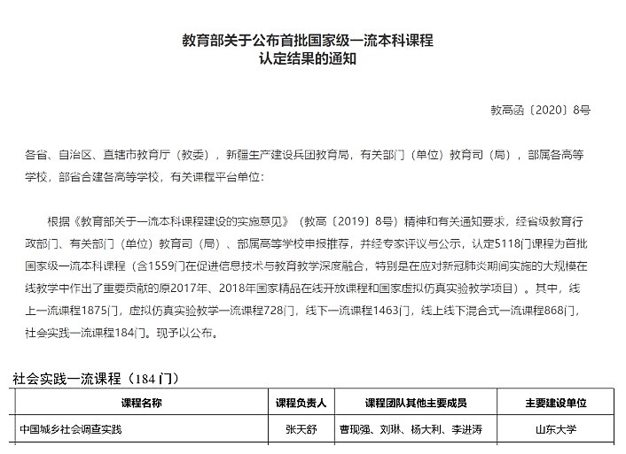 近日,教育部发布《教育部关于公布首批国家级一流本科课程认定结果的通知》,澳门网投张天舒老师领衔的《中国城乡社会调查实践》喜获认定,获批社会实践类国家级一流本科课程。