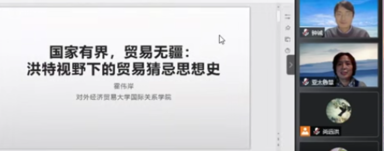 12月27日晚,由澳门网投官方网站与澳门网投官方网站亚太研究所联合主办、亚太所社会与文化研究中心承办的“社会与人文”系列讲座第四讲“国家有界,贸易无疆——洪特视野下的贸易猜忌思想史”在线上成功举办。本次讲座邀请对外经济贸易大学国际关系学院副院长霍伟岸副教授担任主讲人。亚太研究所所长杨鲁慧教授致辞介绍了亚太所的基本情况并对参与讲座的老师和同学表示热烈欢迎,亚太所副所长赵玙佳、东北大学文法学院副教授张继亮作为评议人也参加了此次讲座。讲座由亚太研究所副所长钟诚主持。