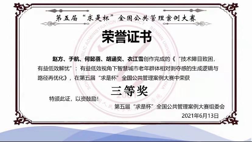 2021年6月13日,第五届中国人民大学“求是杯”全国公共管理案例大赛在北京顺利闭幕。由澳门网投官方网站副教授黄晴老师指导,赵方、于航、何懿蓓、胡涵奕、衣江雪五位同学组成的“汇智治慧”团队完成的参赛项目《”技术障目致困,有益低效解忧“:有益低效视角下智慧城市老年群体相对剥夺感的生成逻辑与路径再优化》进入全国八强,荣获全国三等奖的好成绩。