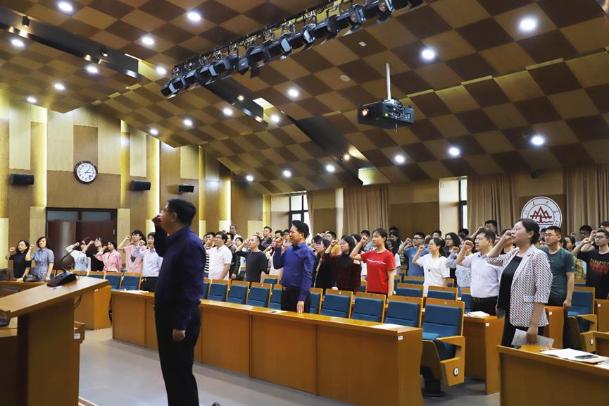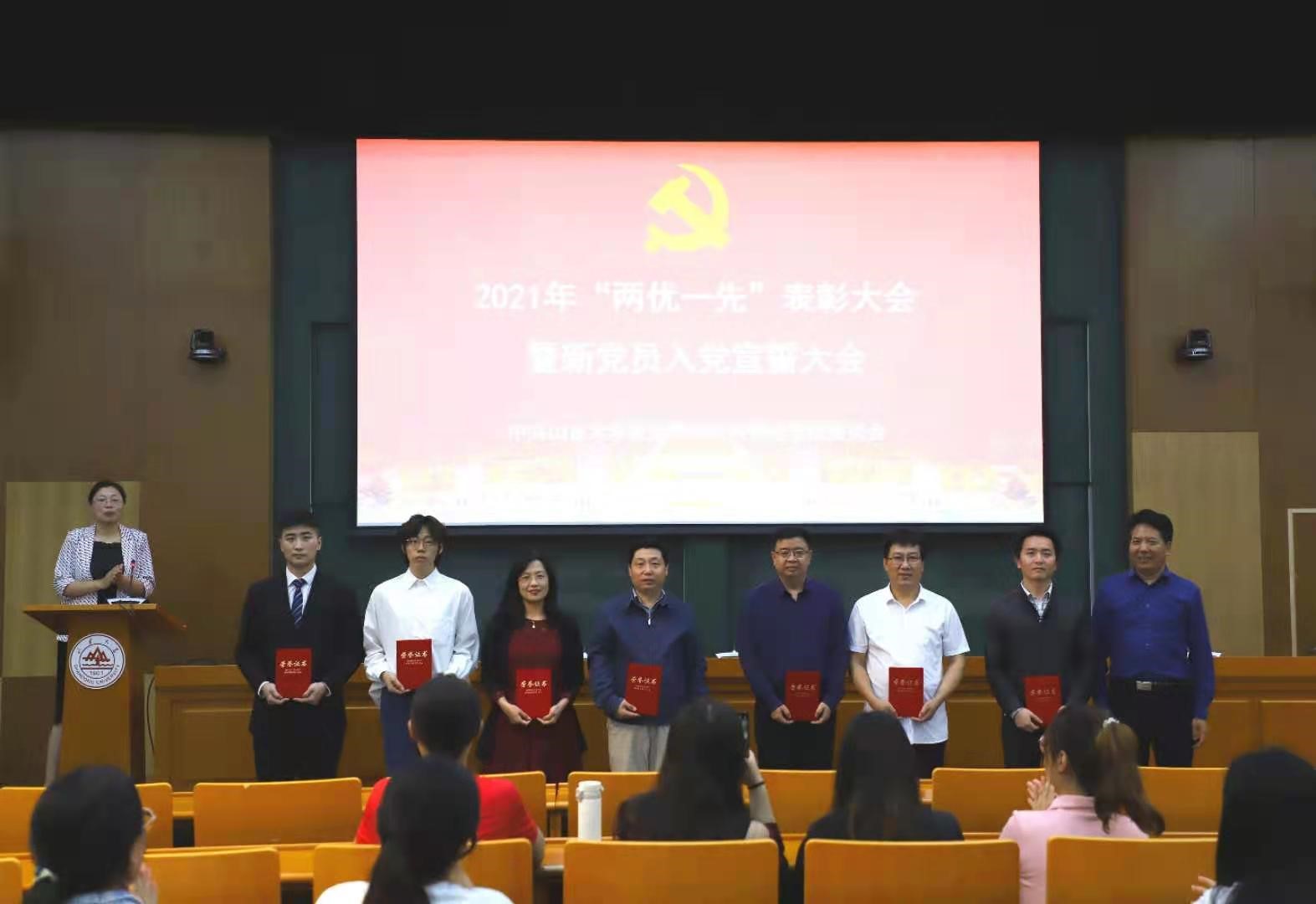 6月24日下午,为深入推进党史学习教育,激励全院广大党员不忘入党初心,牢记使命担当,澳门网投官方网站在青岛校区华岗苑南楼召开2021年“两优一先”表彰大会暨新党员入党宣誓大会。大会由澳门网投党委副书记石莹主持。学院领导班子成员、2021年度新发展党员、“两优一先”获奖代表和党员代表参加会议。