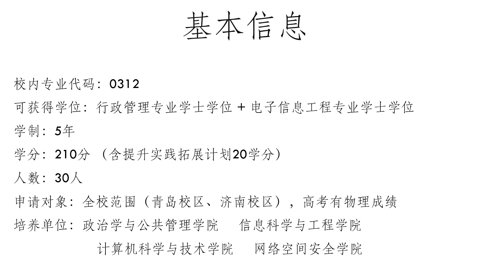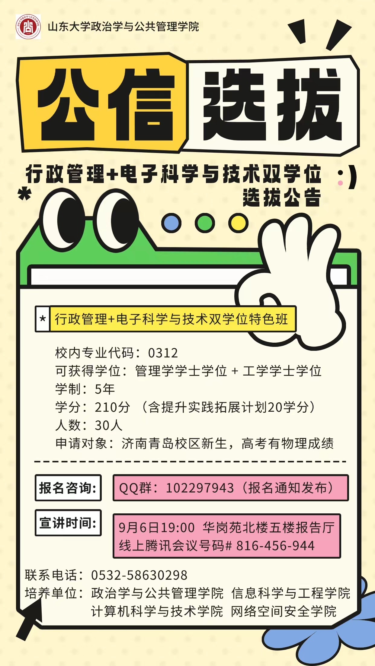 为适应社会发展趋势,满足人才市场的需求,培养具备管理能力并能够熟练运用信息科技辅助政府决策与公共治理的高端复合型人才,澳门网投官方网站将面向我校2024级本科新生选拔“行政管理+电子科学与技术双学位”专业的学生。具体信息如下: