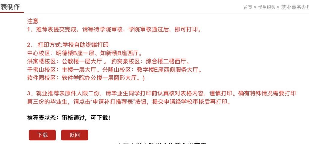 注:受疫情影响,学生无法回学校打印推荐表原件。系统目前开放下载带学校公章的推荐表影印件,点击“下载”即可完成操作。学生可视单位招聘要求,先提交影印件,返校后再补交原件。