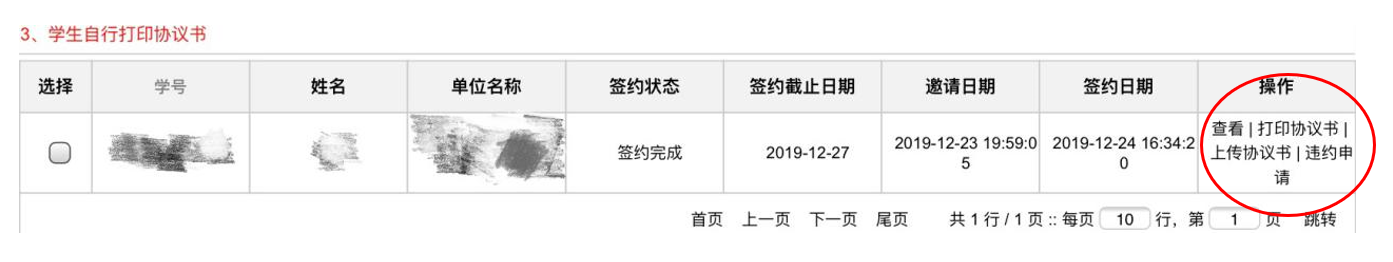 3、签约完成后,学生可在“操作”中选择“打印协议书”,或直接通过终端进行打印。协议书一式三份,用人单位、学生、学校各执一份。